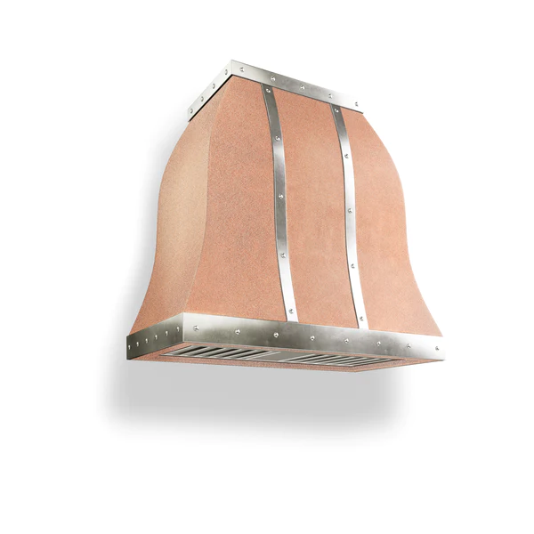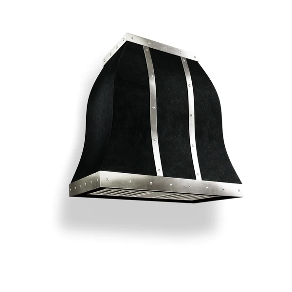 One of our most popular designs, this unique, bell-shaped range hood will add a special something to your kitchen space. Heavy on straps and rivets, and with elegant, curved lines, this custom range hood will be the star of your kitchen, if not your entire home. This range is fully customizable and is available in over twenty finishes. Shop in elegance directly on our website, or speak directly with a design consultant to learn more.